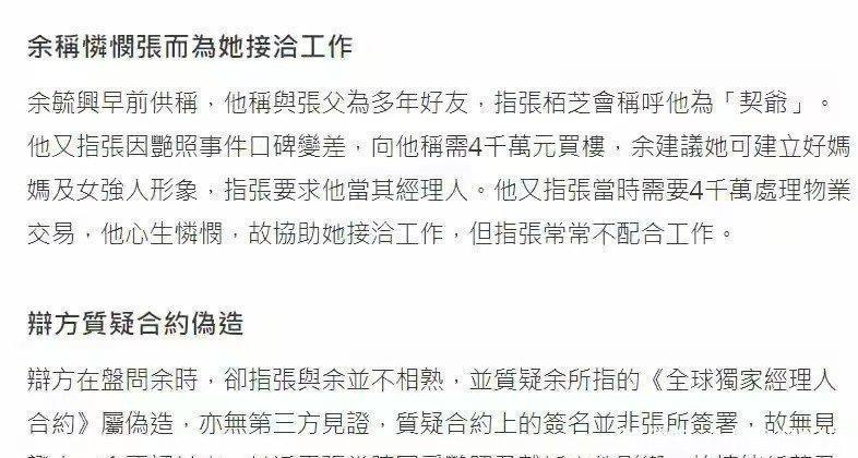 这次在法庭上,她看上去精神很差,还提到自己很多合同都是让私人助手和经纪人帮忙处理的。她和前经纪人余毓兴之间的矛盾其实早就有了,对方告她签了合约,约定要拍六部戏,结果她拿了钱,戏却没拍完。